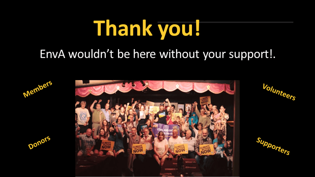 Our new committee will have the task of setting EnvA’s direction for the next year – no easy job as there is so much we could be doing as you will see in the “What’s next for EnvA?” presentation: