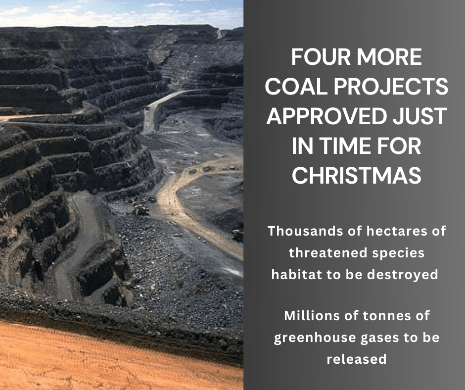 Conservation groups are dismayed at the Albanese Government’s approval of four new coal mines today: Boggabri in New South Wales, and Caval Ridge Horse Pit, Lake Vermont Meadowbrook and Vulcan South in Central Queensland.