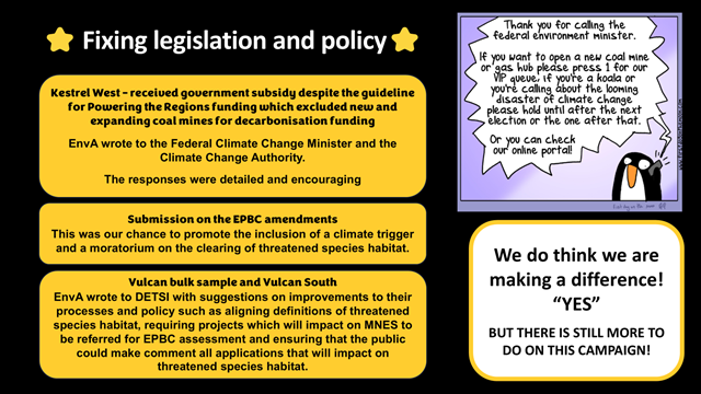 We don’t recieve government or fossil-fuel company funding, so we are not contrained in what we say and do. EnvA relies on like-minded people to keep us active as a voice for our community.